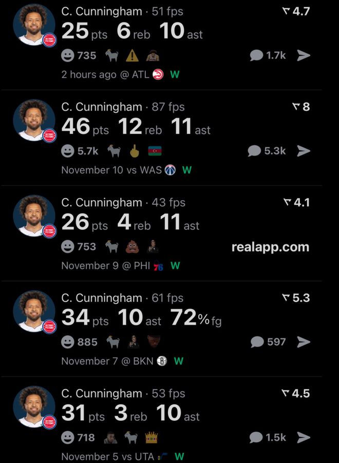 2025年11月19日 活塞力克老鹰11连胜 康宁汉姆25+6+10 杰伦·约翰逊25+8+9