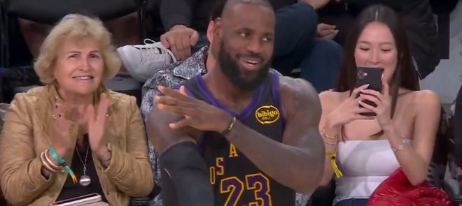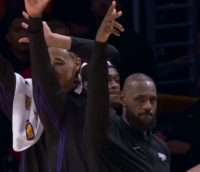 比赛最后时刻,布朗尼也获得了上场机会,一上来就命中了一记三分,在场边看的勒布朗比自己投进三分还有开心。
